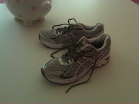And they are not orange! Actually, the first pair the nice lady at the Ski Rack who helped me brought out were orange, and the second pair was teal…but thankfully when I mentioned those were not my favorite colors…she brought out these. The best running shoes for me…and they are fuchsia! J That’s Gaston my piggy bank in the picture too…everyone needs a pink polka dotted piggy bank, right?